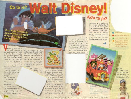 Tento článek o Waltu Disney vyšel roku 1995 v dětské příloze Pes Novák časopisu Ano. V té době běžely v televizi seriály Detektiv Duck a Aladin. Omluvte prosím vystříhané obrázky (které v té době byly vzácné) a přečtěte si článek o životě Walta Disneye